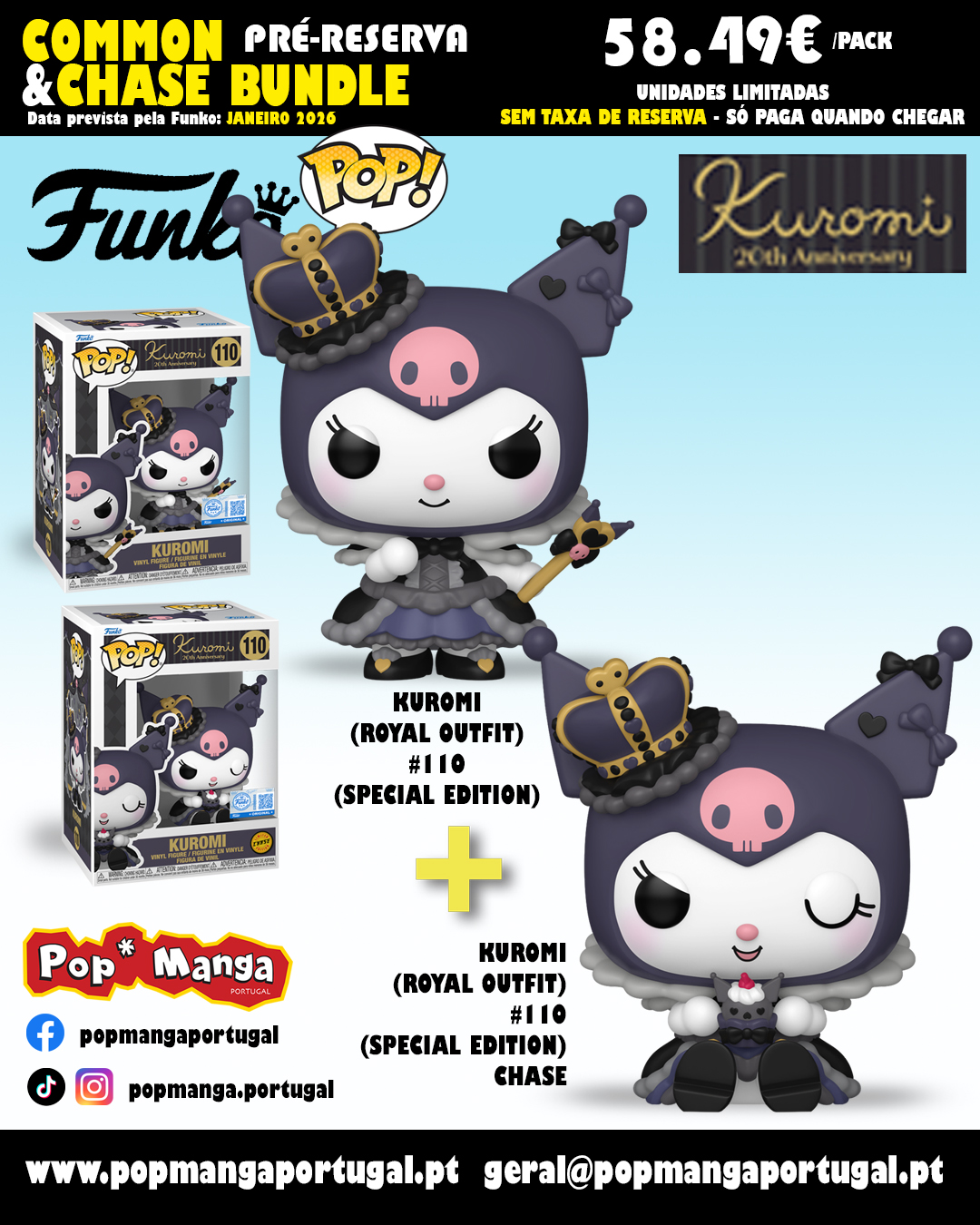 PRÉ-RESERVA - Funko Pop! "Kuromi": BUNDLE Kuromi (Royal Outfit) (20th Anniversary) #110 (SPECIAL EDITION) + CHASE